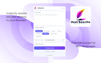 JustRewriteは、Chromeブラウザ内でテキストを簡単に強化するために設計された強力なAIライティングアシスタントです。この無料のアドオンは、ユーザーが任意の書かれたコンテンツをリライト、パラフレーズ、洗練させることを可能にし、メール、ソーシャルメディアの投稿、ドキュメントに最適です。主な機能には、文法とスペルの修正、カスタマイズ可能なトーン(プロフェッショナル、カジュアル、フレンドリー)、ソーシャルメディアのエンゲージメントのための絵文字やハッシュタグを追加する能力が含まれています。ユーザーはまた、ライティングを拡張または圧縮し、100以上の言語にテキストを翻訳することができ、多様なライティングニーズに対応するための多目的ツールとなっています。